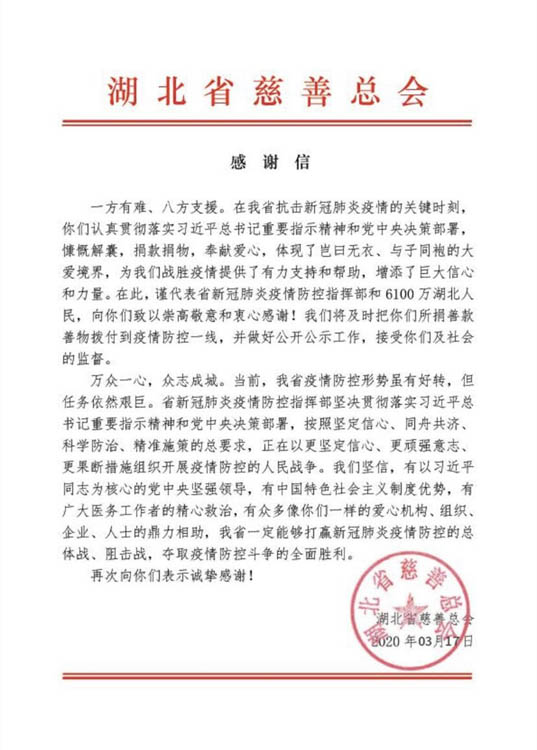 露水河林业局在慈善事业中又添辉煌一笔。近日,湖北省慈善总会在官方微信公众号上,表扬和肯定了该局在2020年新冠疫情期间,向湖北疫区医务人员和受灾群众捐赠人民币100320元的公益行为,向露水河林业局颁发了捐赠证书并致感谢信一封,以感谢全局职工对湖北疫区医务人员及受灾群众的关心和支持,并对捐赠者崇高的人道主义精神和慈善义举表示感谢和敬意。