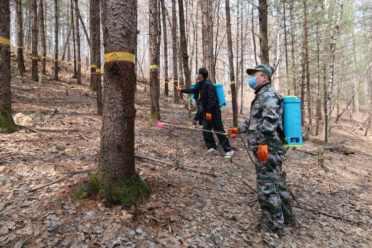 随着天气逐渐回暖,临江林业局森防站通过对前一阶段胶带缠环的松树进行观察,发现闹枝林场部分松林区域越冬代松毛虫已经开始出现了上树聚集现象。由于闹枝林场辖区面积大、松林多,防控任务较重,志愿者们主动联系,来到闹枝林场辖区的三公里油坊沟,配合森防检疫站对松毛虫相对聚集的松林喷施甲维盐进行防治。