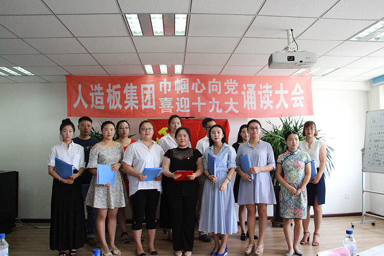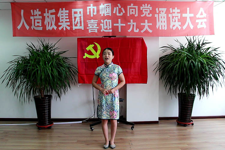 2017年8月2日,为庆祝中国共产党成立96周年,迎接党的“十九大”胜利召开,人造板集团工会在集团机关三楼会议室举办了“巾帼心向党,喜迎十九大”诵读比赛。机关全体员工通过诗歌朗诵的形式,重温党的光荣历史和丰功伟绩,热情讴歌伟大祖国改革开放和现代化建设的伟大成就,进一步激发了广大员工爱党爱国的热情,展现了积极向上的精神风貌。