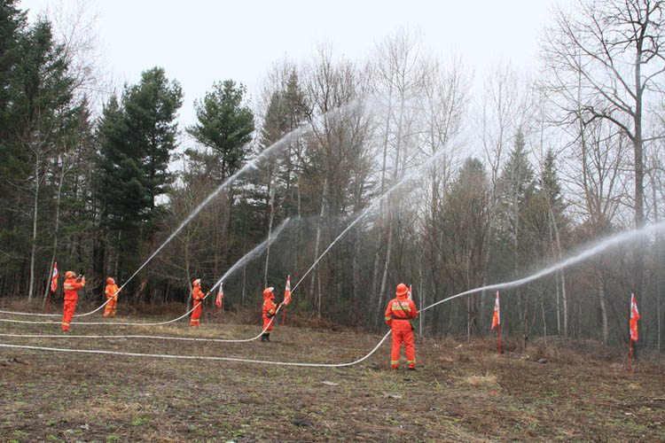 “闹枝林场半专业扑火队集合完毕,应到22人,实到22人,其中医疗救护1人,队员携带风力灭火机5台,背负式水枪5个,水泵1台,2号工具7个,请指示。”各扑火队伍到达火场后立即向现场指挥员报到,并根据指挥员指令,迅速行动。背负式风力灭火机、背负式水枪、二号工具齐上阵;同时,利用就近水源,架设水泵、联接水带、水枪加入战斗。