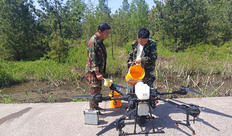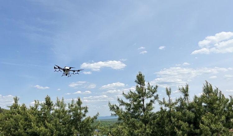 伴随着“嗡嗡”的旋翼转动声,载满药剂的植保无人机按着设定航线,从松林上方飞过,药液在距离树顶上方约两米处均匀喷洒而下。仅半个小时的时间,一片百亩的松林喷洒完毕。这是临江林业公司使用无人机防治落叶松毛虫的一个场景。