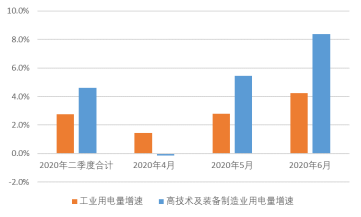 另一方面,高技术行业用电量强劲反弹,继续引领工业高质量发展。二季度,高技术及装备制造业用电量同比增长4.6%,超出工业用电量增速约2个百分点。其中,对比4月来看,5月和6月高技术行业用电量同比增速分别快速反弹至5.4%和8.4%,大幅高出工业用电量增速9.3个百分点和10.8个百分点。由此可见,作为“中国制造”的一股中坚力量,高技术行业已摆脱前期疫情带来的困境,重新回到快速发展轨道上来,未来必将继续引领我国工业高质量发展。  图2 工业与高技术行业用电量增速对比