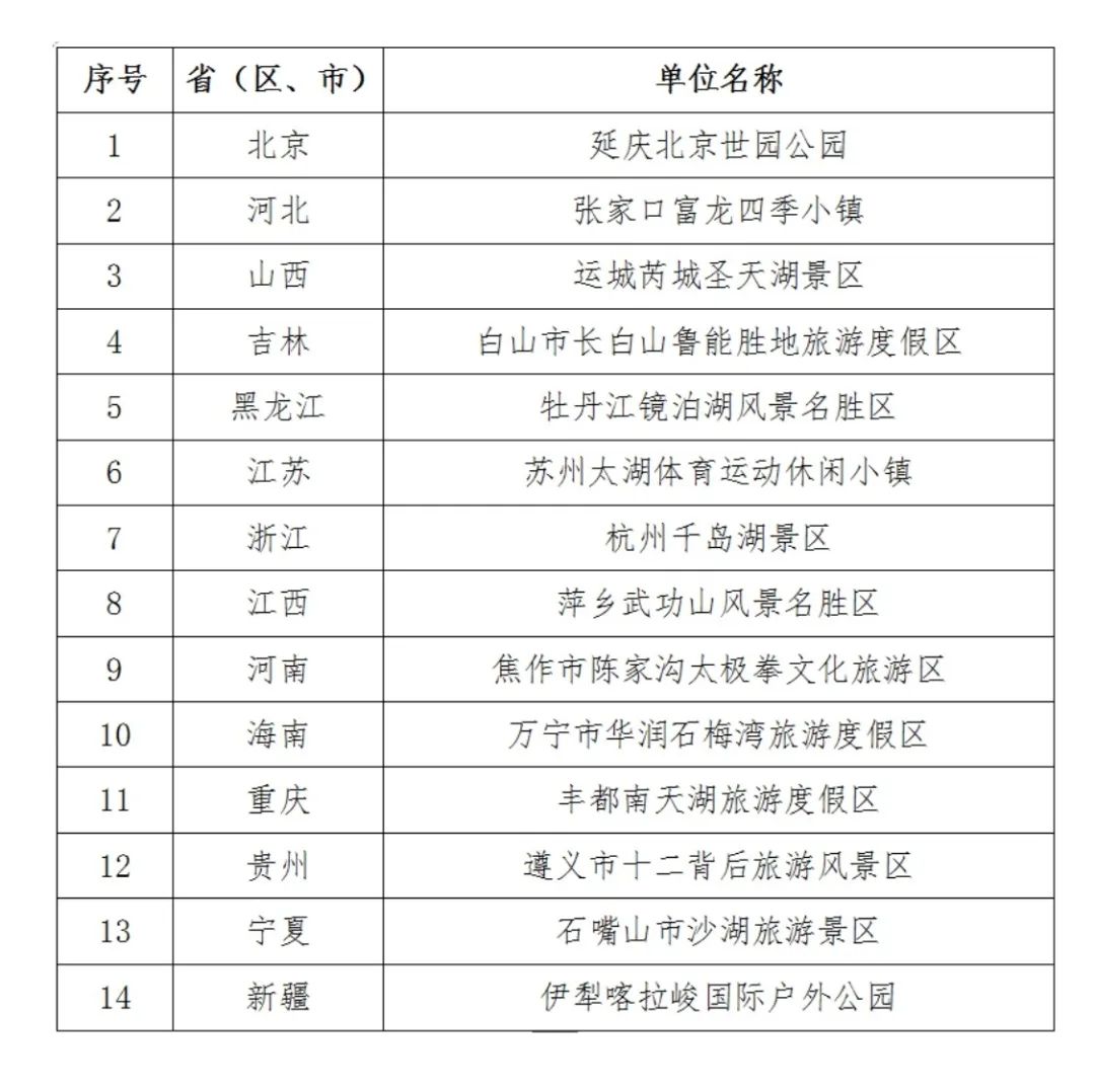 根据《体育总局办公厅 文化和旅游部办公厅关于开展2022年国家体育旅游示范基地申报工作的通知》(体经字〔2022〕207号),在各省(区、市)体育行政部门、文化和旅游厅(局)推荐申报基础上,体育总局、文化和旅游部组织专家评审和现场评估,经社会公示后,现认定北京世园公园等14家单位为国家体育旅游示范基地。