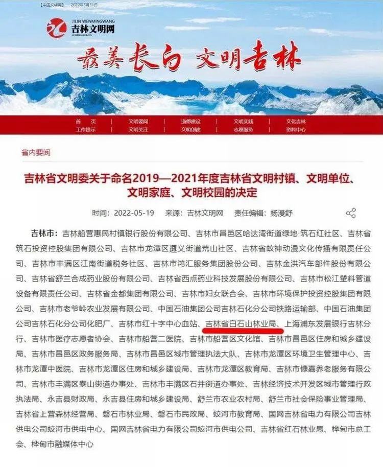 近日,吉林省精神文明建设指导委员会作出《关于命名2019—2021年度吉林省文明村镇、文明单位、文明家庭、文明校园的决定》,白石山林业有限公司(原白石山林业局)荣获“2019-2021年度省级文明单位”称号。