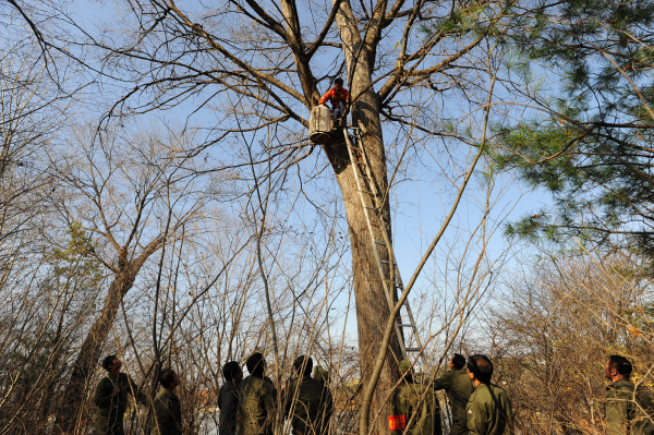 10月16日,泉水森林资源管护大队在泉阳湖秋沙鸭栖息地的周边树木上,布设了10个人工巢穴,为它们建好了舒适的新家。该巢穴为自然形成的空心树桶,工作人员在树桶上开设洞口,便于秋沙鸭进出。为便于观测,又将人工巢穴进行编号、登记,为加强对中华秋沙鸭的监测保护,掌握其种群习性和分布特点做好了充分准备。